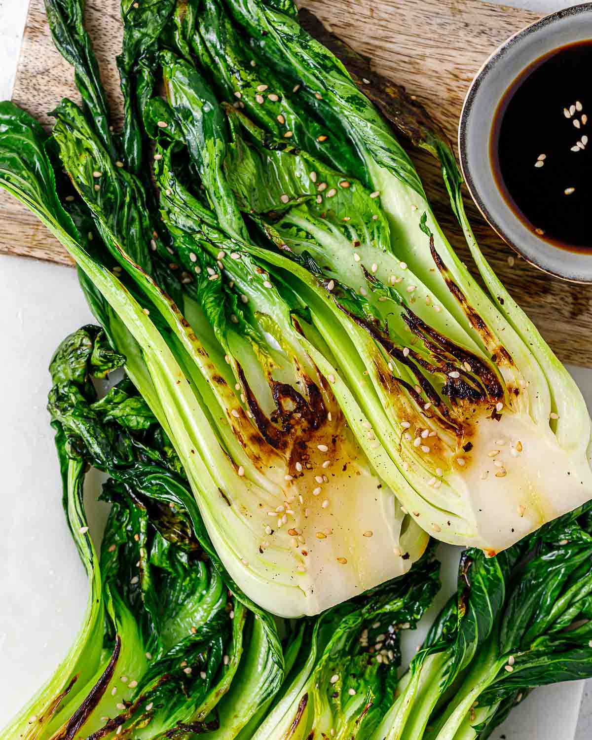 Bok Choy is tender, sweet, and stands up well to heat — making it an EXCELLENT choice for grilling. Absolute perfection served with coconut aminos (soy sauce type flavor but slightly less salty) and freshly toasted sesame seeds.