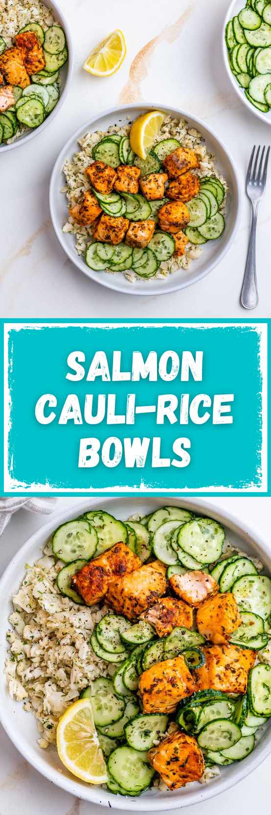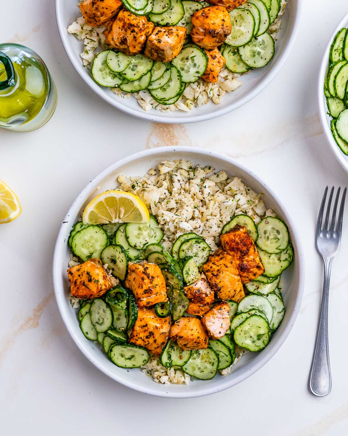 Each bite is a beautiful balance of flavor and texture, with the savory seasoned salmon, cool crisp cucumber, and lemony cauliflower rice all coming together in a bowl you’ll want to enjoy for lunch or dinner on the regular!