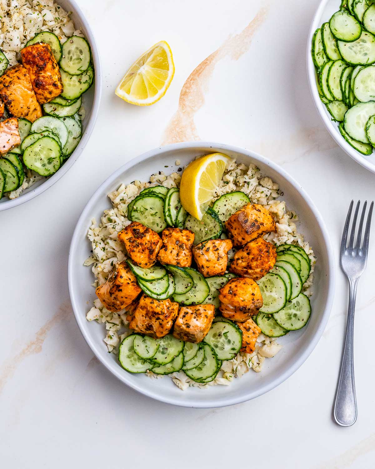 Dive into perfectly seasoned tender-crispy salmon bites combined with the refreshing crunch of cucumber, all atop a bed of fluffy fried cauliflower rice. It’s an excellent blend of protein, healthy fats, and veggies that will leave you feeling nourished and satisfied.