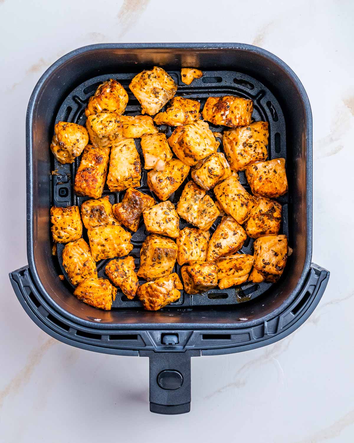 - Add your air fried salmon and garnish with additional fresh dill and a lemon wedge if desired.