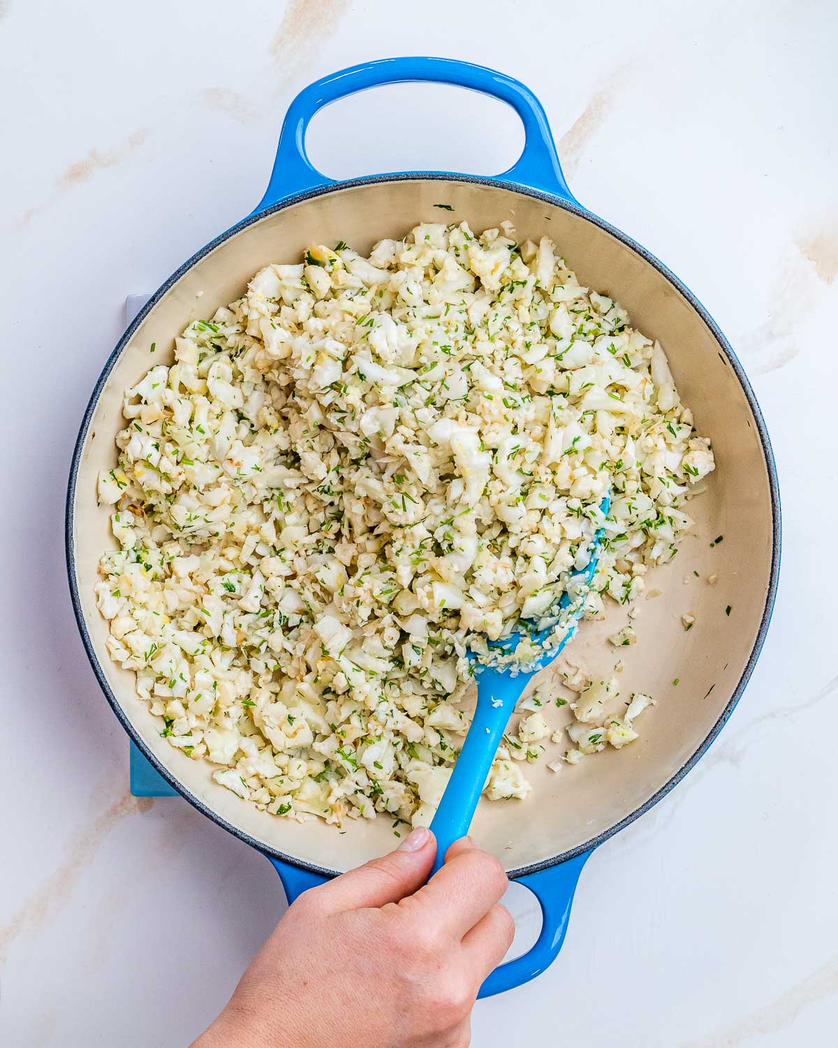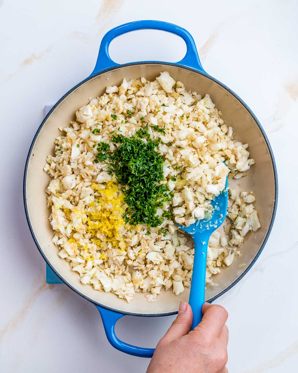 - Heat 1 Tablespoon of the oil in a large skillet and stir-fry your cauliflower rice, stirring frequently, for about 5 minutes. Season with sea salt, pepper, lemon zest and half of the lemon juice and half of the fresh dill. Set aside.
