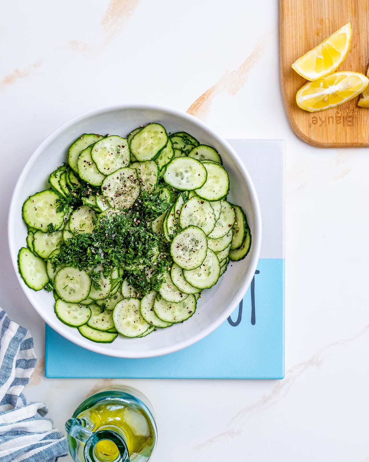 - Thinly slice your cucumber and place in a bowl. Drizzle with the remaining fresh lemon juice, olive oil and dill; Stir to coat and combine well.