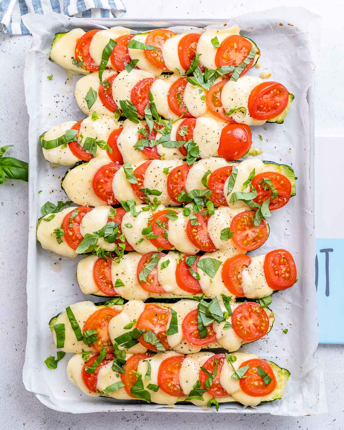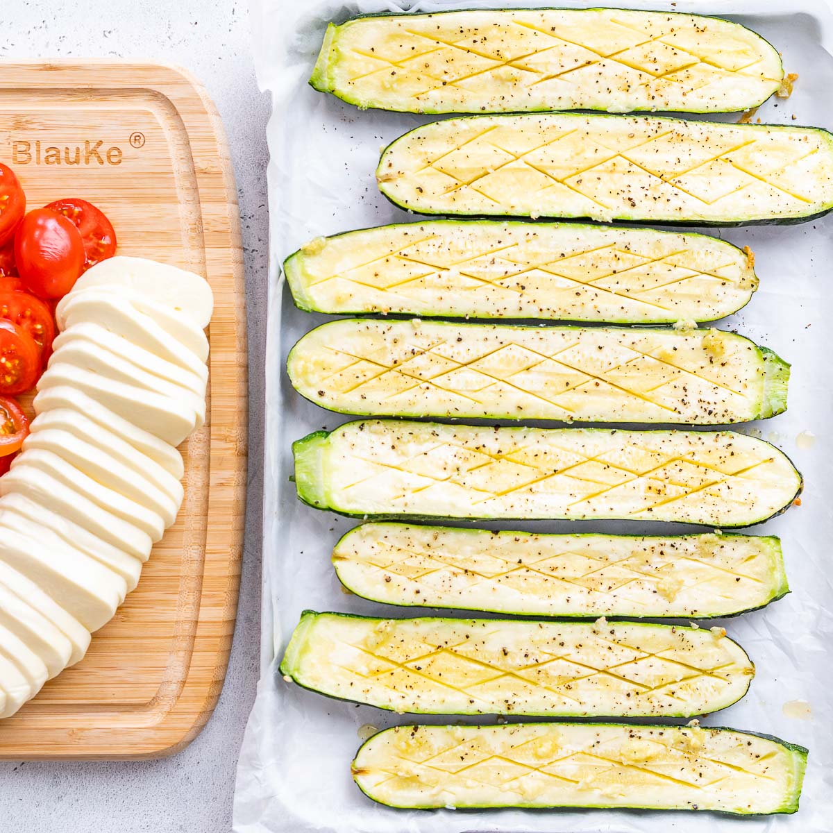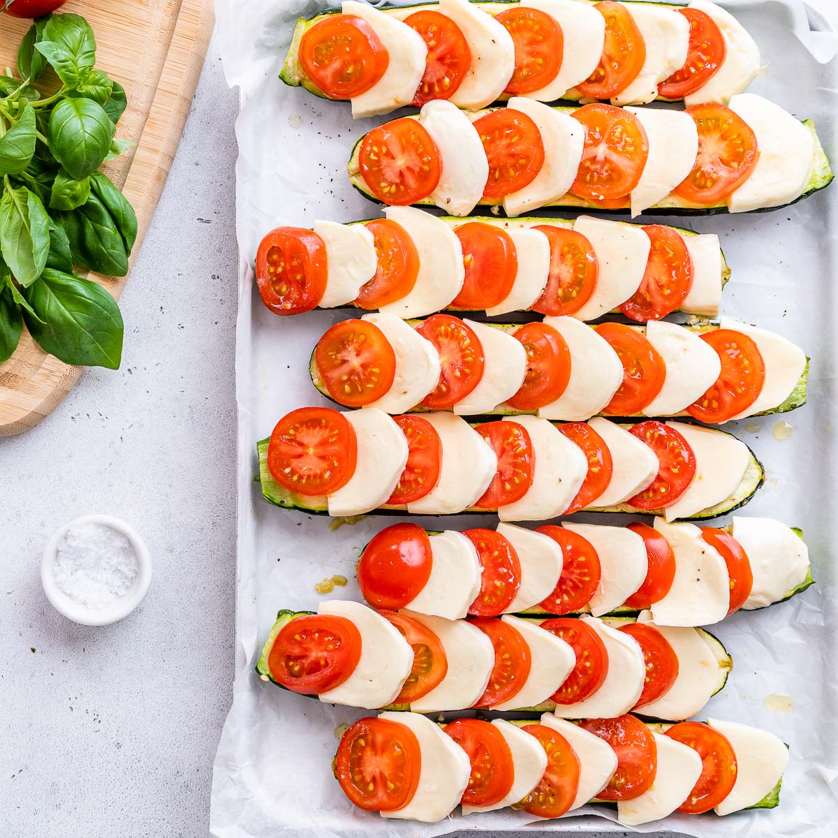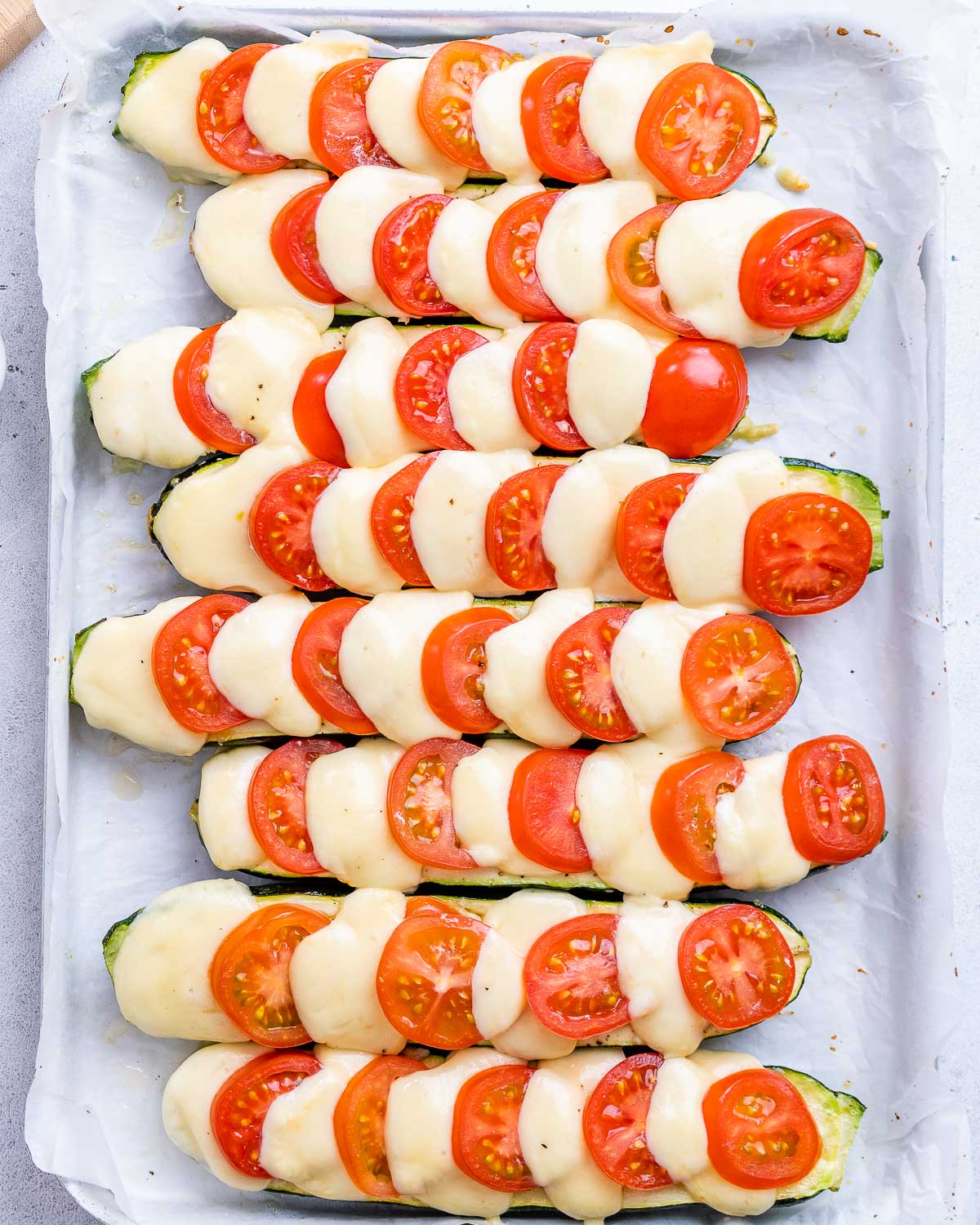 - Once the zucchini is finished baking, remove from the oven and top with a slice of mozzarella followed by a tomato slice. Repeat this pattern until all the zucchinis are covered, as shown in the photos.