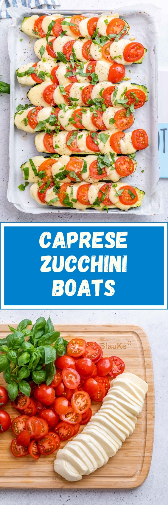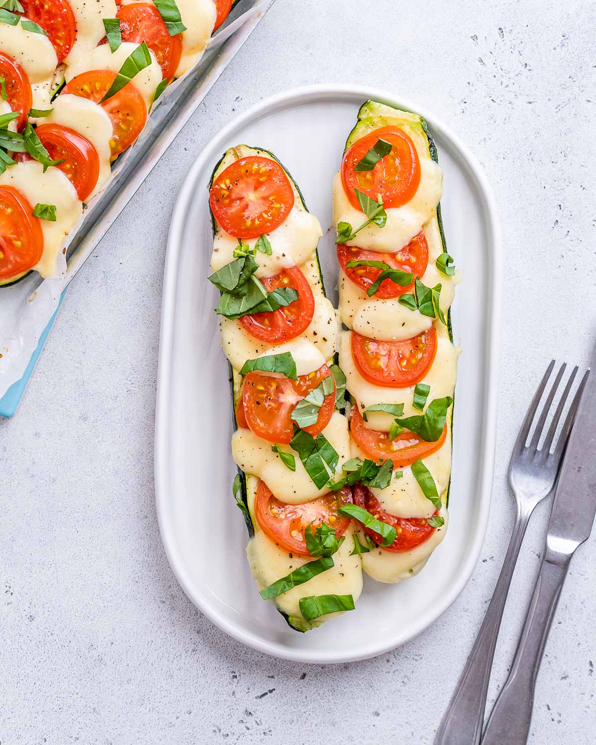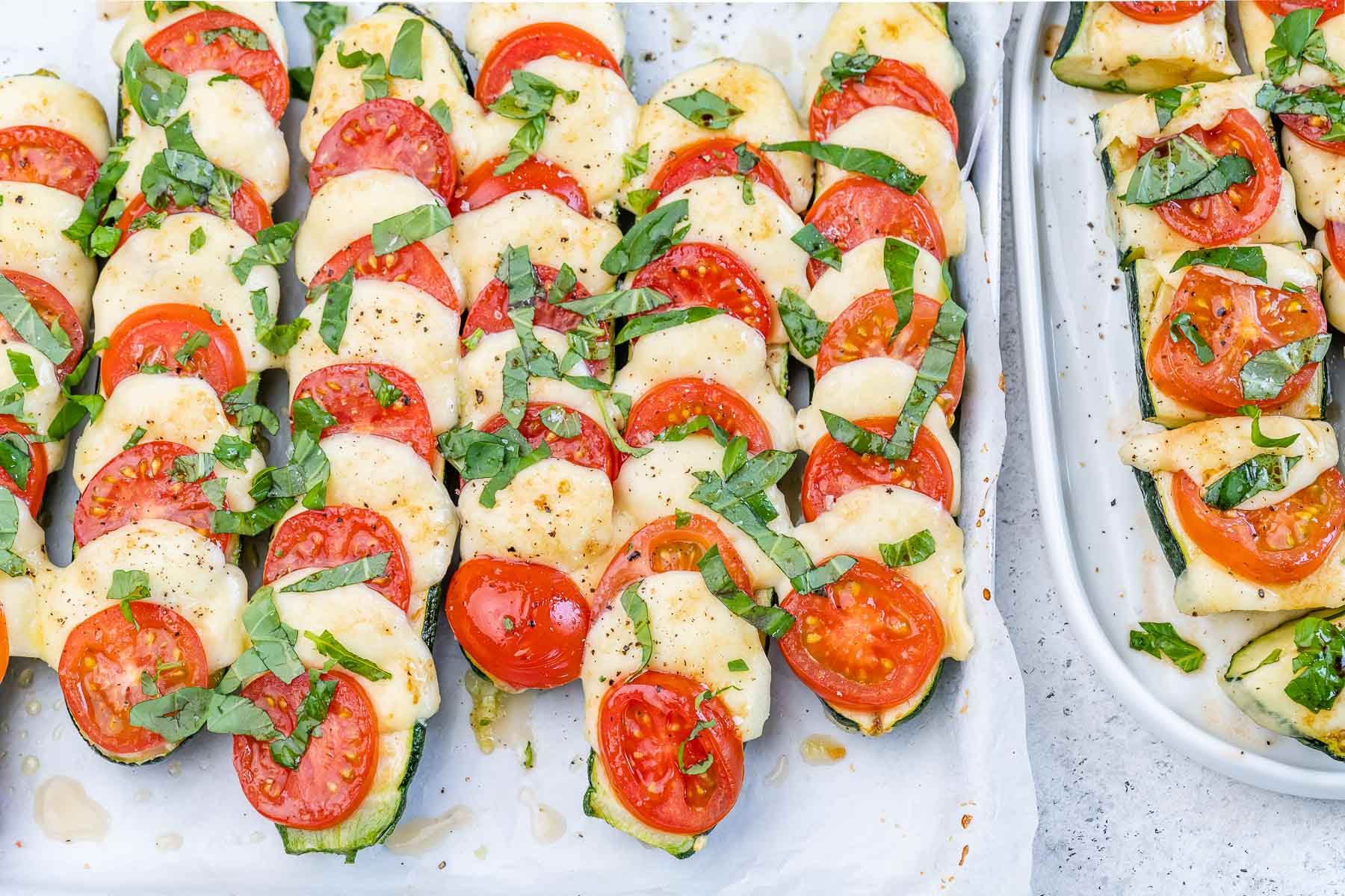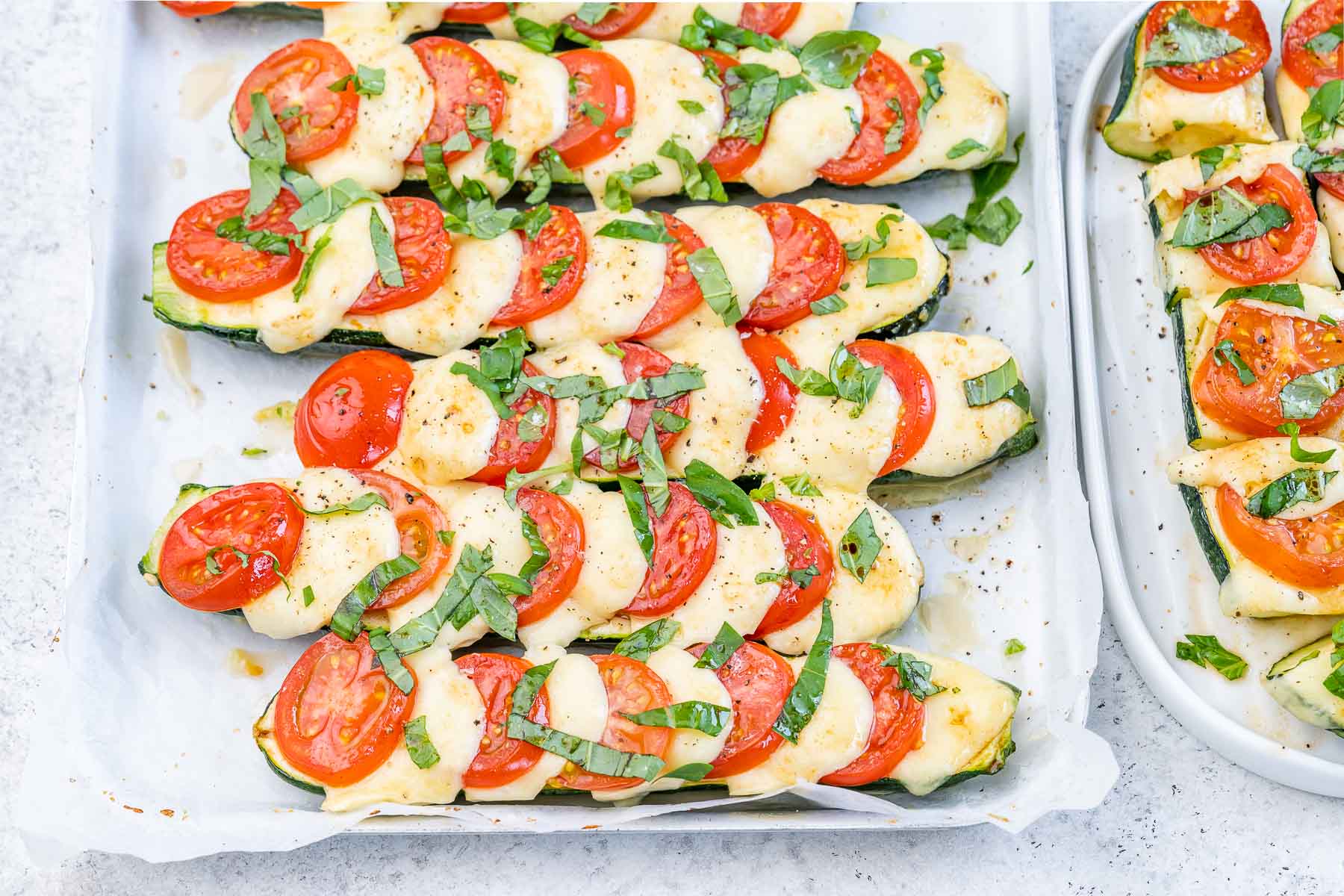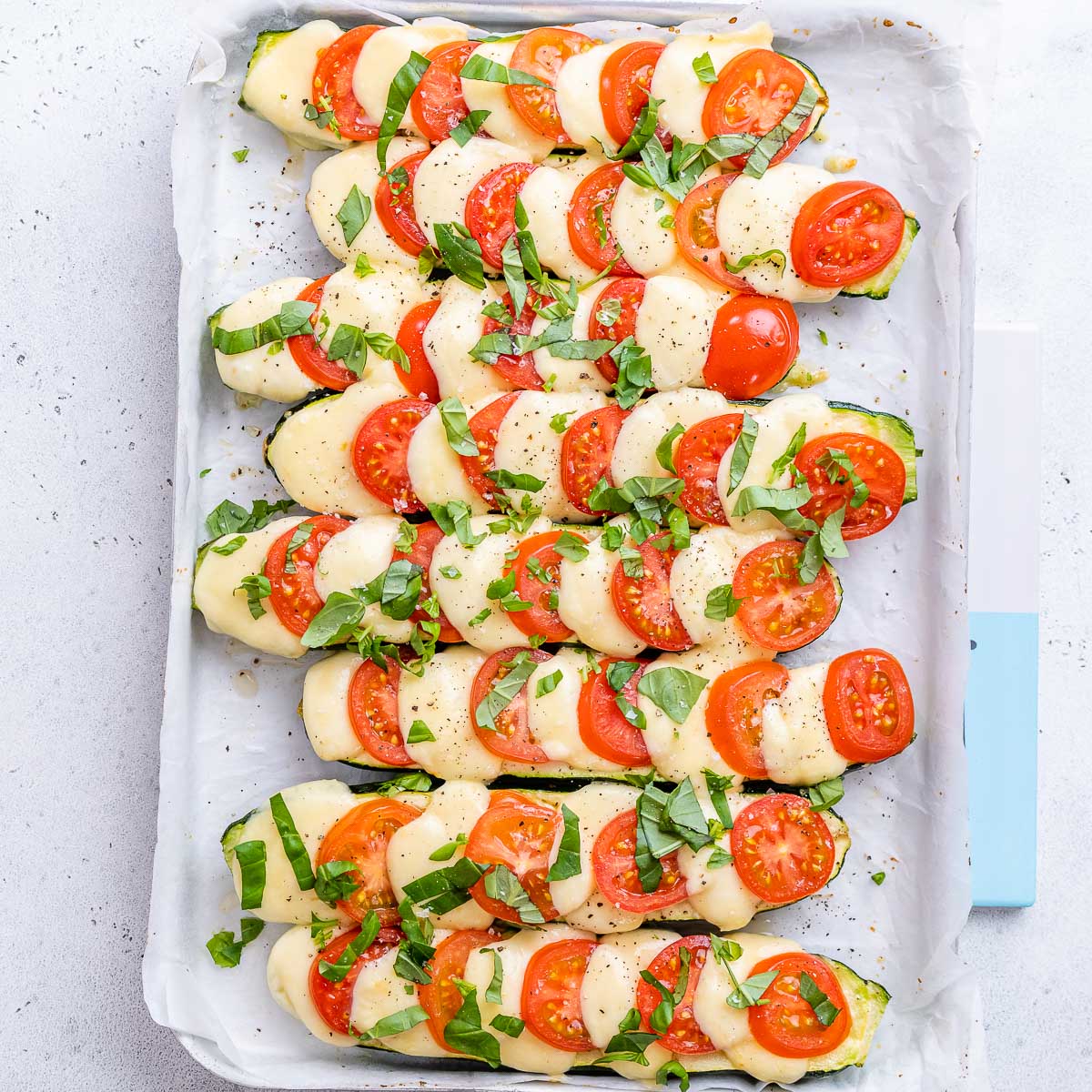 - Once the zucchini is finished baking, remove from the oven and top with a slice of mozzarella followed by a tomato slice. Repeat this pattern until all the zucchinis are covered, as shown in the photos.