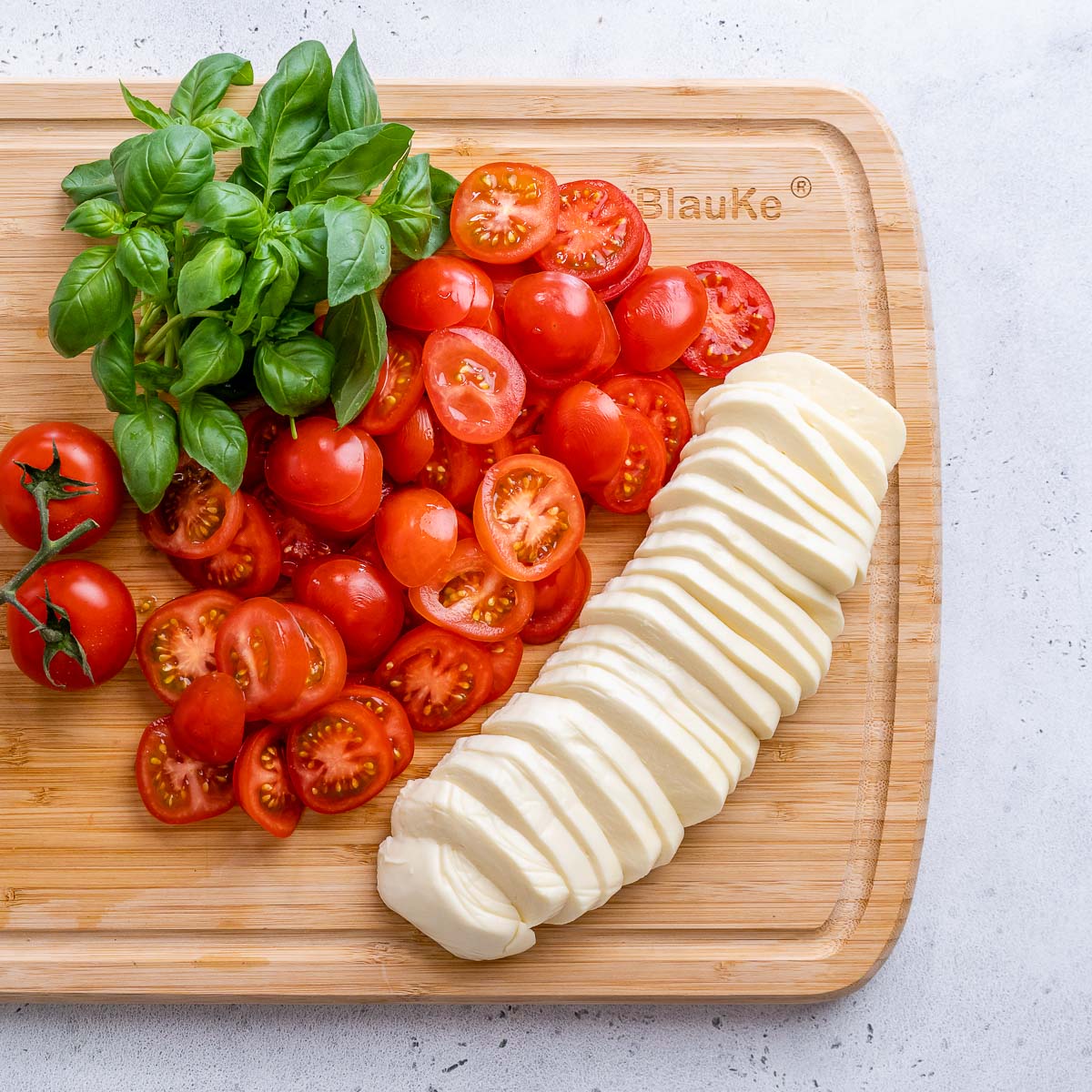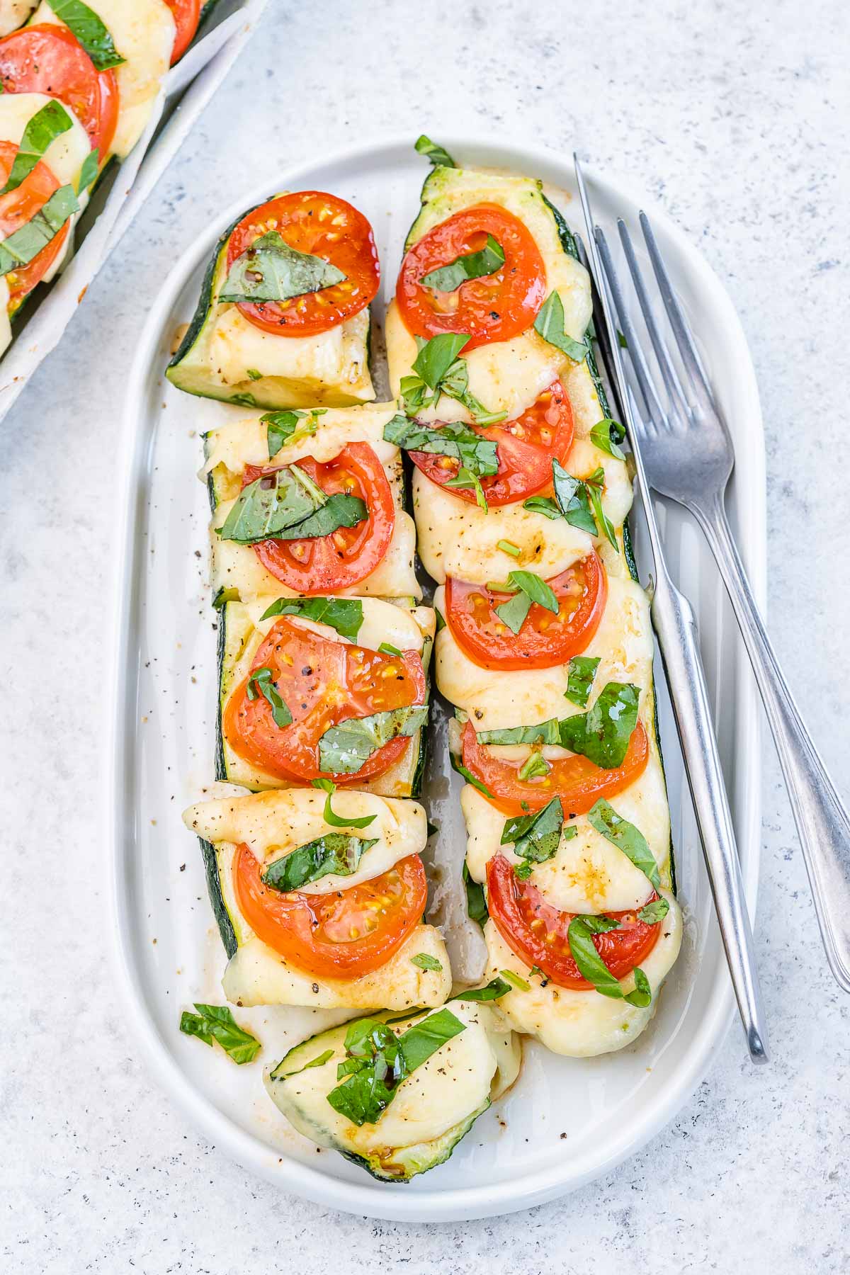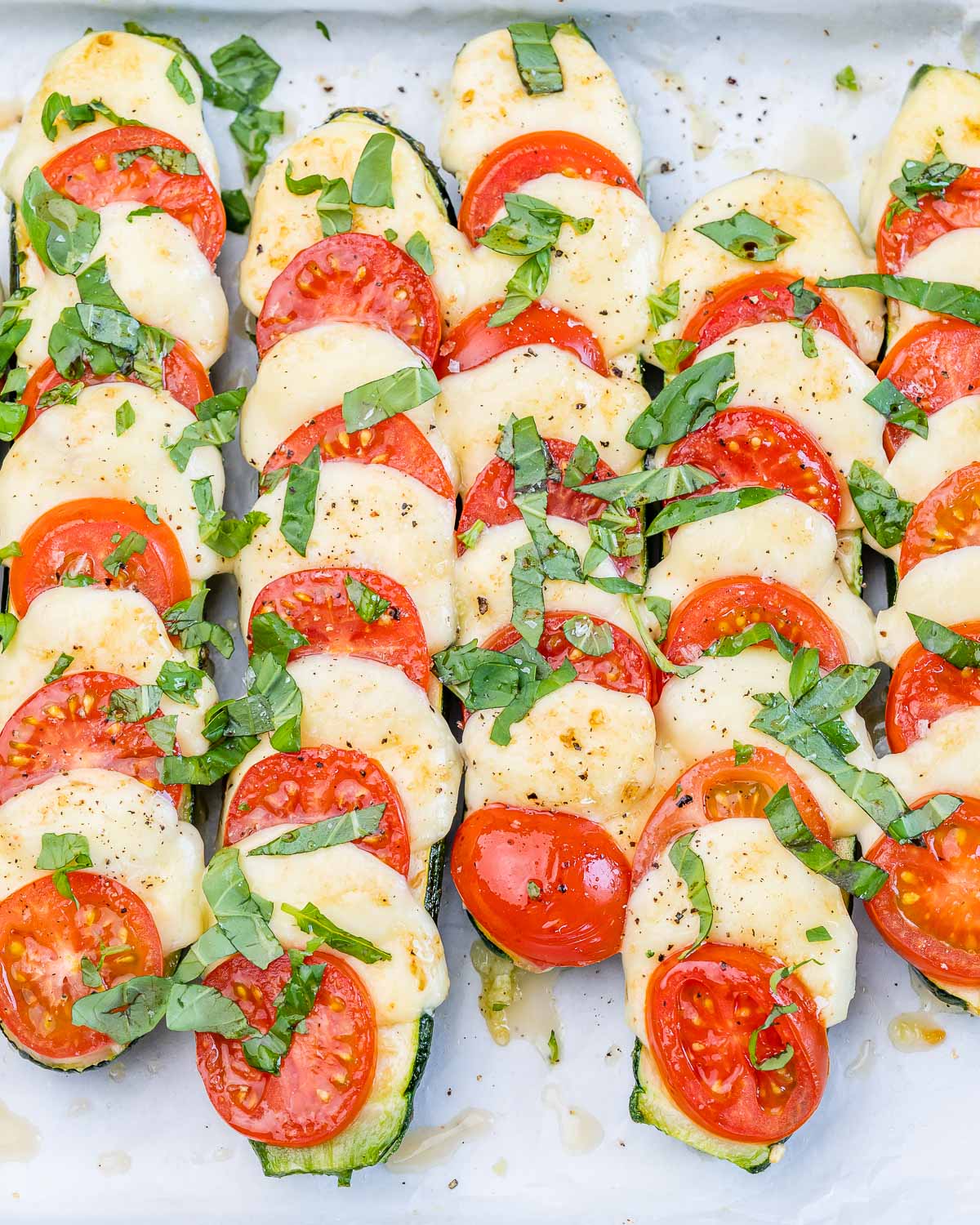 - Quickly chop the basil and sprinkle your caprese zucchini with it.