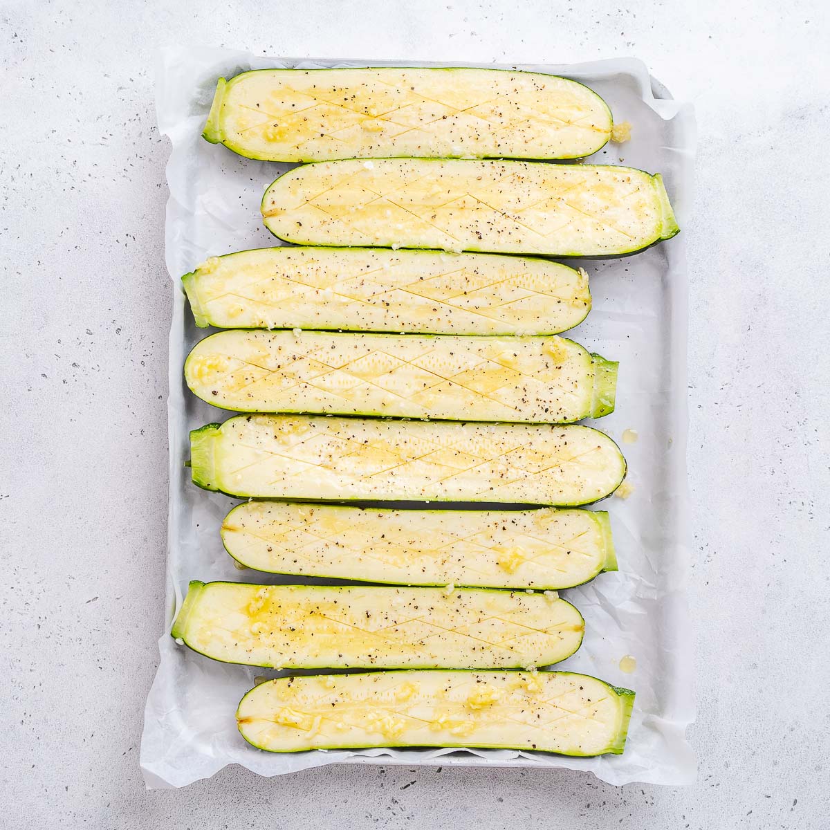 - Halve each zucchini lengthwise and make several thin cuts on diagonally as shown in the video, making sure you don't go all the way through. This will help them cook faster.