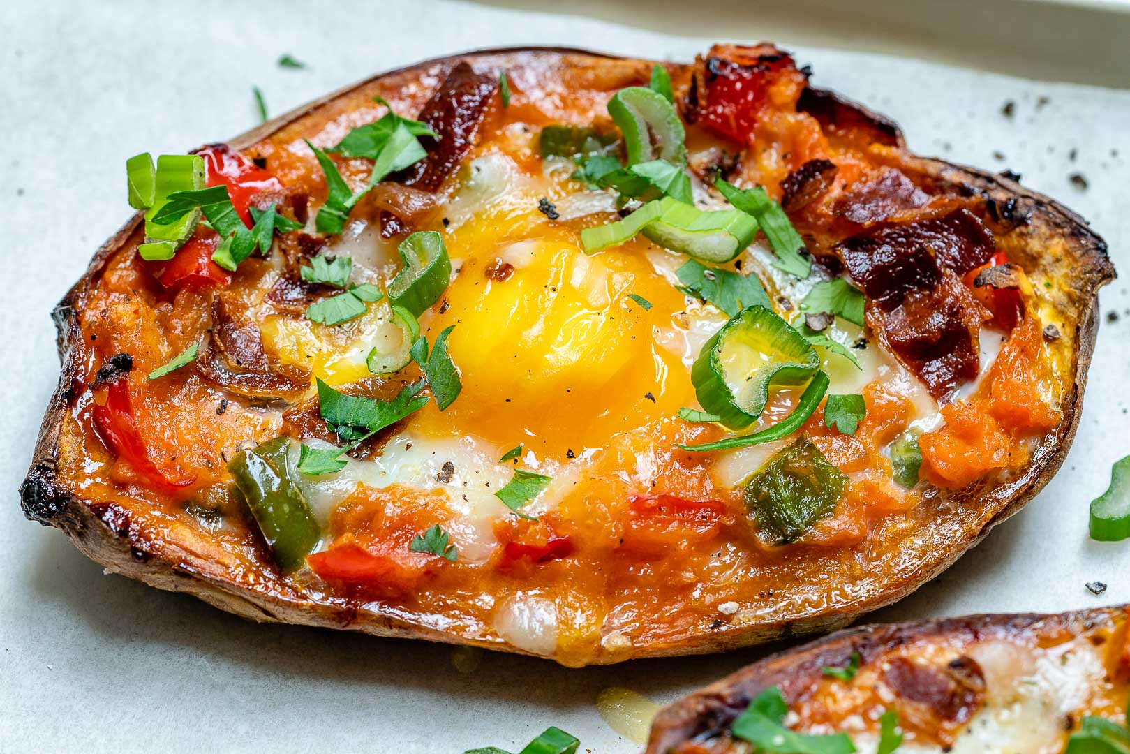 15. Twice Baked Stuffed Sweet Potatoes with Bacon and Eggs