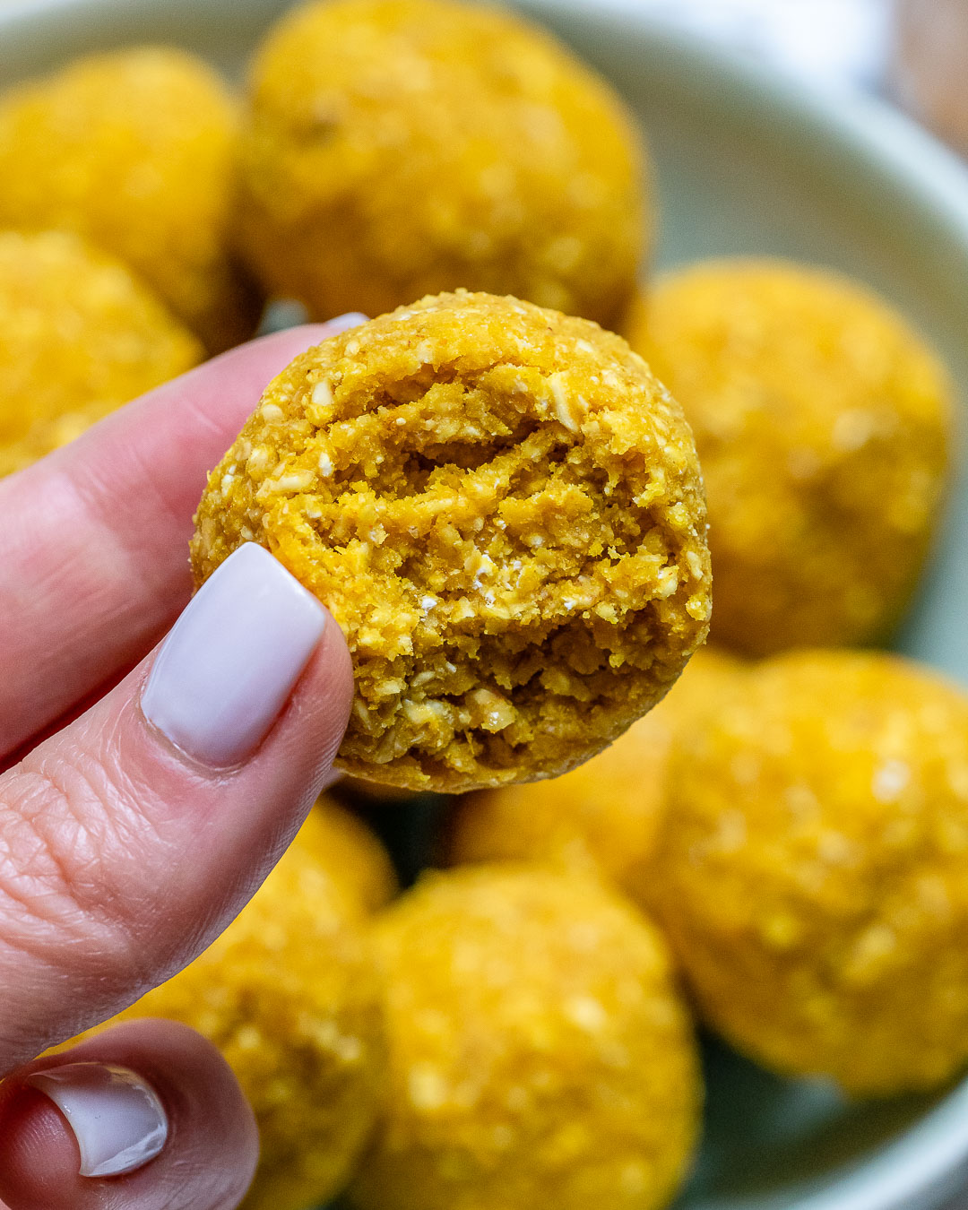 With these delicious protein balls, you can get more of this root and turmeric in your diet! They have a surprisingly sweet + savory + slightly peppery flavor that’s super tasty!